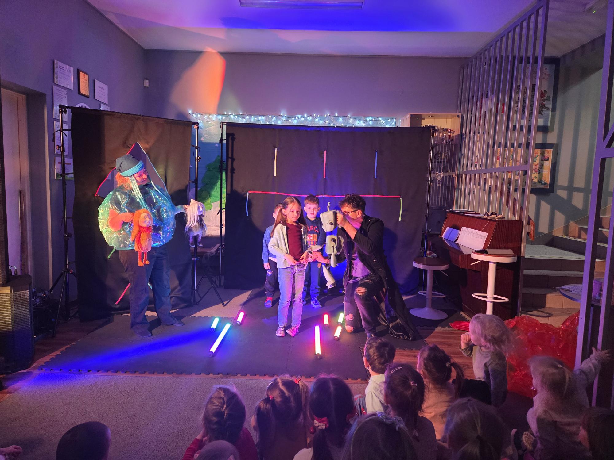 Przedszkolaki aktywnie uczestniczyły w wydarzeniu – reagowały na sceniczne sytuacje, dzieliły się swoimi spostrzeżeniami i z zaangażowaniem przeżywały przygody bohaterów. Było dużo uśmiechu, zaciekawienia i wspólnej refleksji nad emocjami.