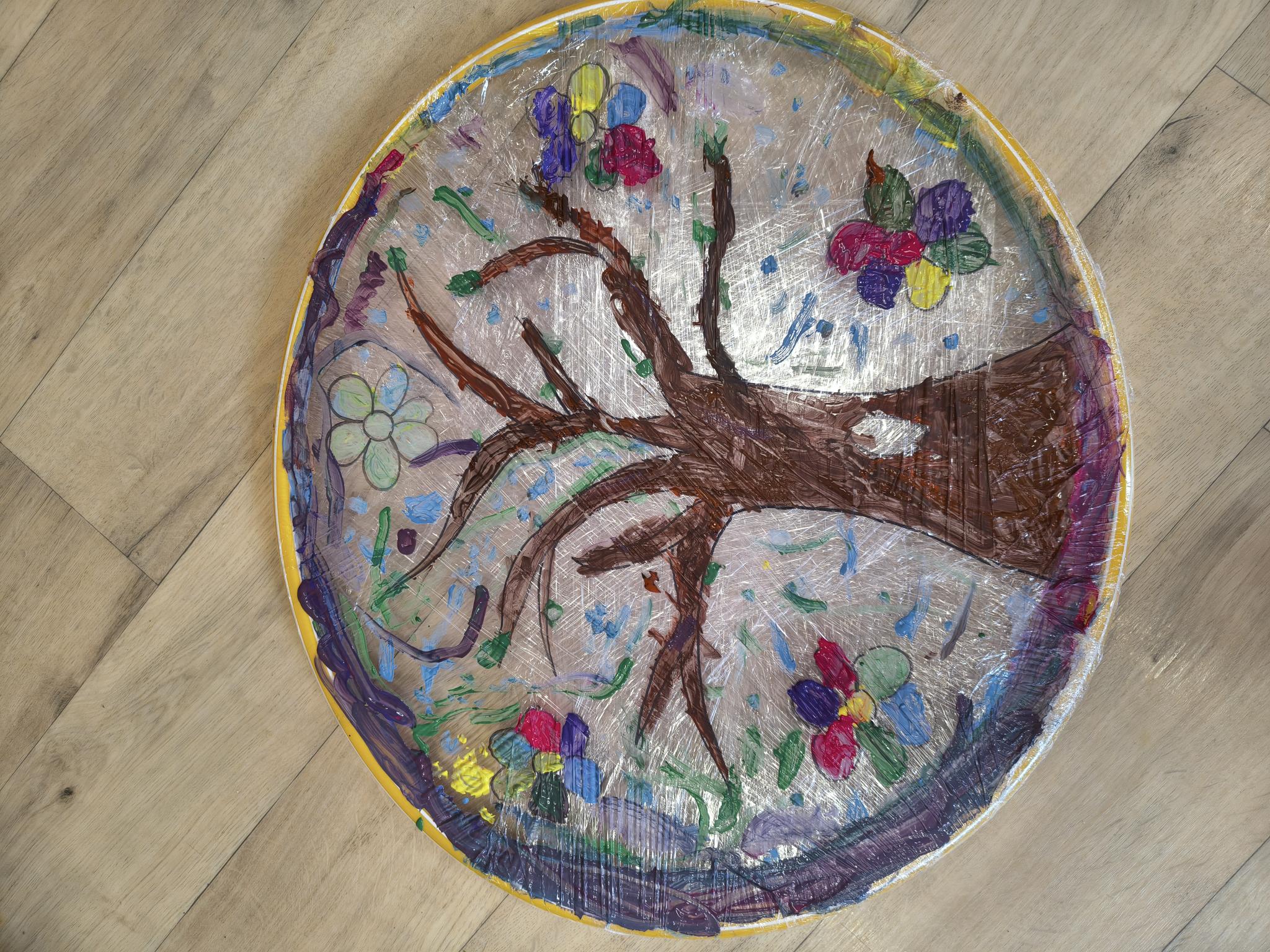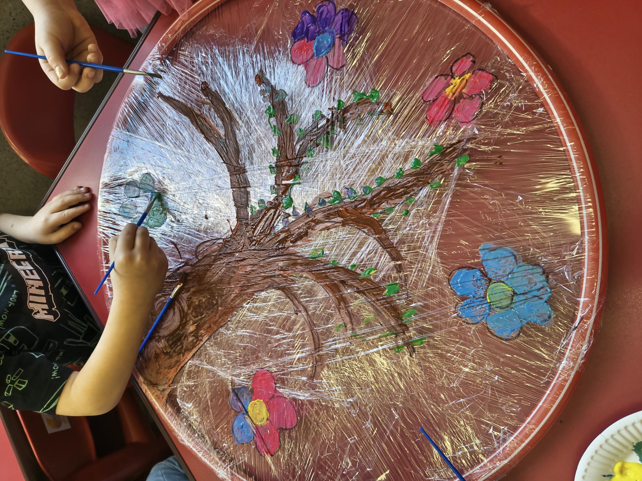 Jedną z naszych ulubionych zabaw było tworzenie wiosennego drzewa na folii rozciągniętej na hula-hop. Dzieci malowały farbami i eksperymentowały z kolorami, tworząc piękne, pełne życia kompozycje. To była nie tylko świetna zabawa, ale także okazja do rozwijania kreatywności i sprawności manualnej.