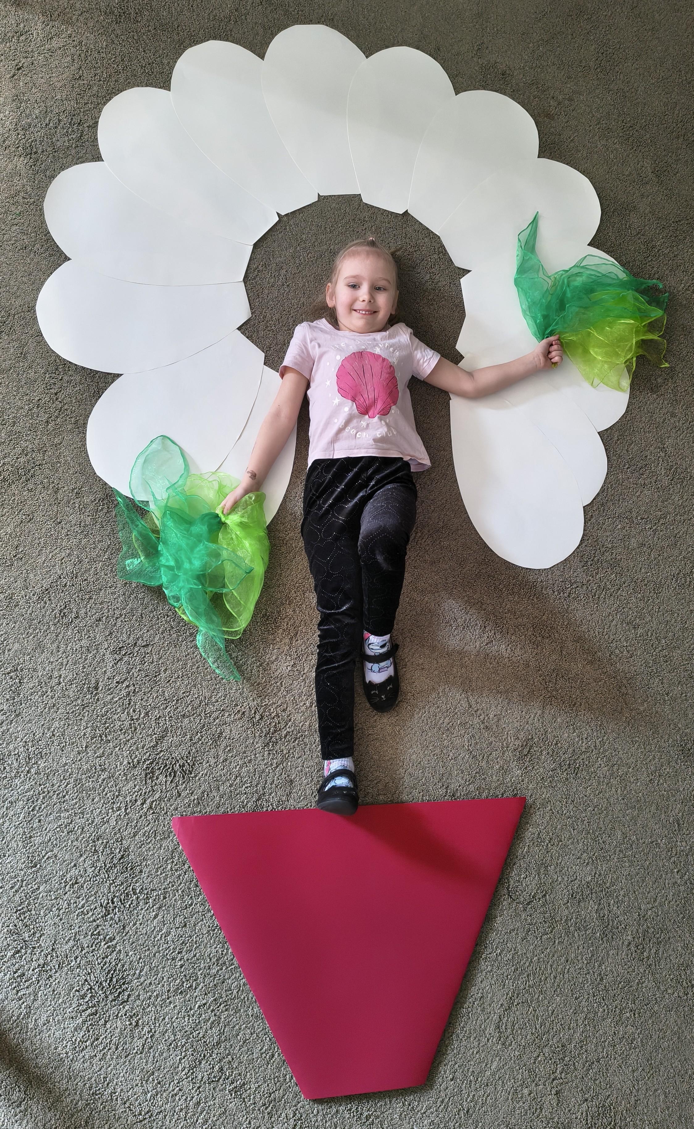 Kolejną atrakcją były „żywe obrazy”, czyli wspólne tworzenie scen inspirowanych wiosną. Dzieci wcielały się w kwiaty, rozwijały wyobraźnię, współpracę i umiejętność wyrażania emocji poprzez ruch.